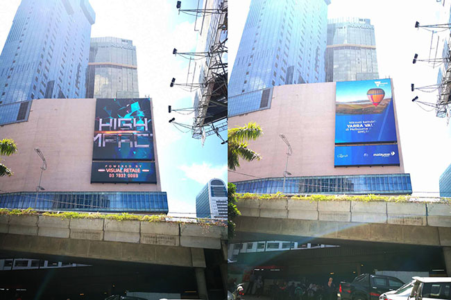繁华之地,从来都是高楼林立、车水马龙。在吉隆坡喜来登酒店的外墙上,两块LED显示屏格外吸睛,一块面积550.5平方,一块137.6平方,合起来近700平方。由于墙面高且视距远,选用的均是钱柜QG777户外防水款P10,该款显示屏性价比高,采用抗紫外线、抗变形模组套件,保障屏体不变形。点亮之时,屏面颜色均匀、画质逼真,播放稳定流畅,拍照毫无水波纹。甚至在太阳的直射之下,字体、细节均清晰可见。