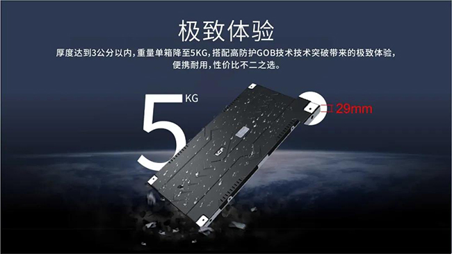 传统LED显示屏的“厚”实际是其外观不美最大败笔,而龙显禧K系列箱体厚度薄如“1元硬币”的直径,安装在墙壁上,犹如一幅精致的壁画!而单箱体的重量却不到5KG,安装及运输都很轻便!加上GOB工艺具有防磕碰,防尘,防潮的功效外,还能使显示屏的墨色更加均匀!