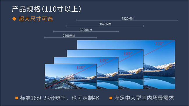标准化是行业发展趋势,16:9的显示比例也匹配高清视频1920X1080的显示比例,龙显禧K系列每个箱体都按照16:9尺寸设计,标准2K显示,可以根据场景大小,轻松任意拼成不同大小同等比例的大屏,呈现高清完美画面;