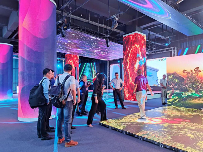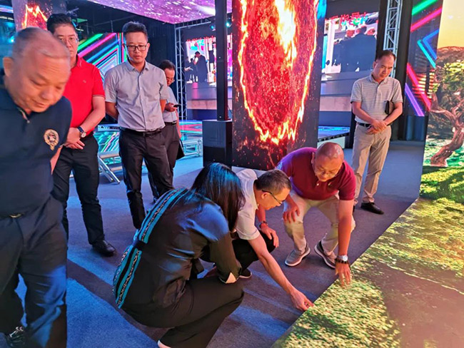 当看到我们的LED沉浸式AR视觉体验馆时,大家都被它酷炫的视觉效果,强互动性所吸引!对龙艺禧的表面GOB镀膜工艺,具有防磕碰,防水防尘防潮的特点,细细触摸体验,并给予好评!